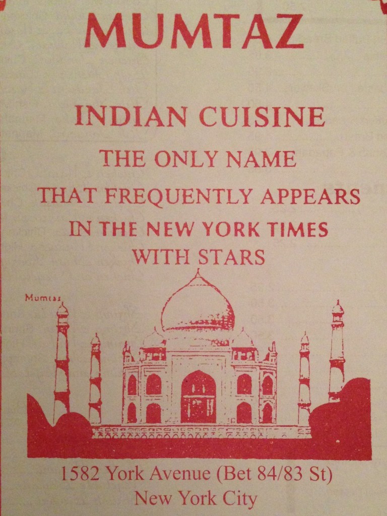 Across the street, between 83rd and 84th, “Mumtaz Indian Cuisine”—in a fancy white script against a bright red scallop-edged awning—jumps out at me.
