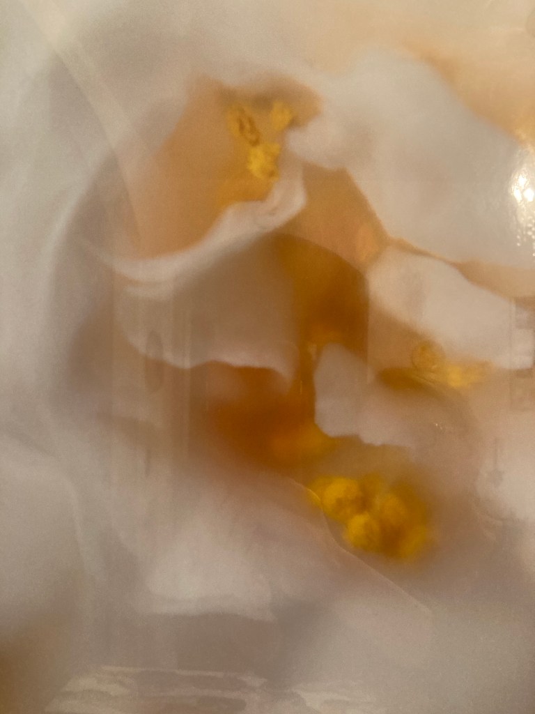 “Sure, no problem,” I reply, watching him pour the pretty-colored liquid out of the short, fatly round, dark brown bottle with the teeny opening at the top and the flourish of orangish-red on the side.