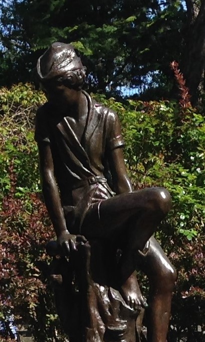 At first I think it is a statue of a young girl with a sailor’s hat. But with a bit more focus, I realize that it is actually a young boy with a feathered cap.