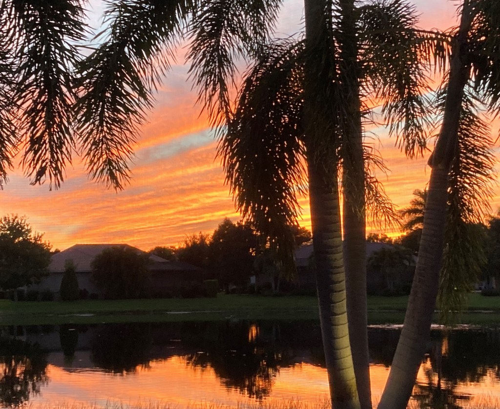 An exquisite Florida Thursday in early June, sunny and peaceful and breezy, the wind chimes jingling and emitting their Zen-like vibes, the palm trees rustling, the lake water glistening.