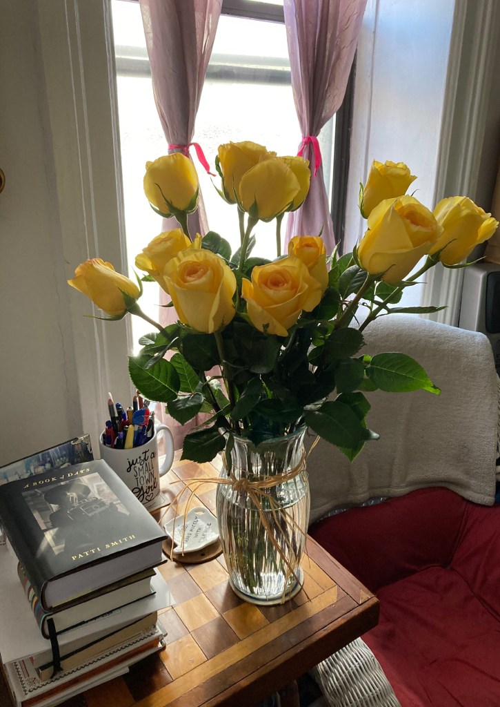 I love a vase of fresh, yellow roses, so much so that Patti Smith’s A Book of Days has to wait for my immersion, if just for a snapshot’s moment.