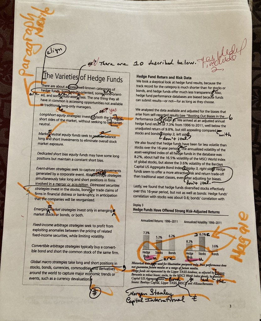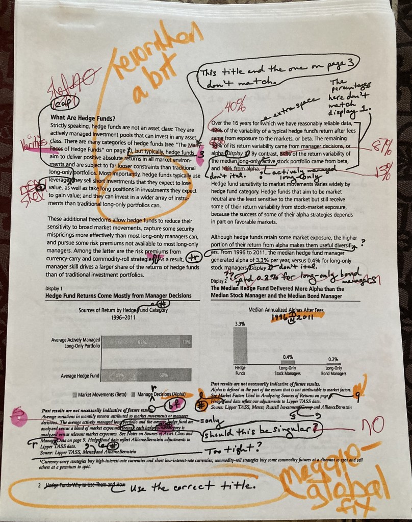 Copyedit/proofread for Bernstein’s research book Demystifying Hedge Funds: Taking a Rigorous Research Approach (my edits are in black)